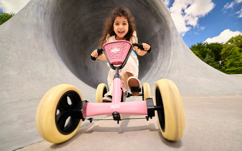 štiri kolesa naredijo BERG Buzzy veliko stabilnejšo in varnejšo izbiro kot tricikel. Pedala niso povezana z krmilom, tako da noge otroka ostanejo trdno na pedalih tudi pri ostrih zavojih. To olajša poganjanje in Buzzy se gladko premika po pločniku in asfaltu - in prav tako hitro gre tudi nazaj!