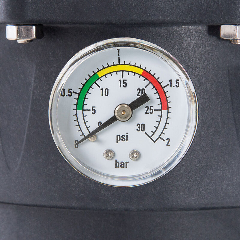 Manometer, vgrajen v 6-potni ventil, vam ne prikazuje le trenutnega delovnega tlaka vaše peščene filtrirne naprave, temveč tudi stanje filtrirnega medija. Lestvica je razdeljena na tri področja.
