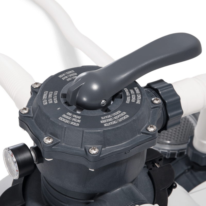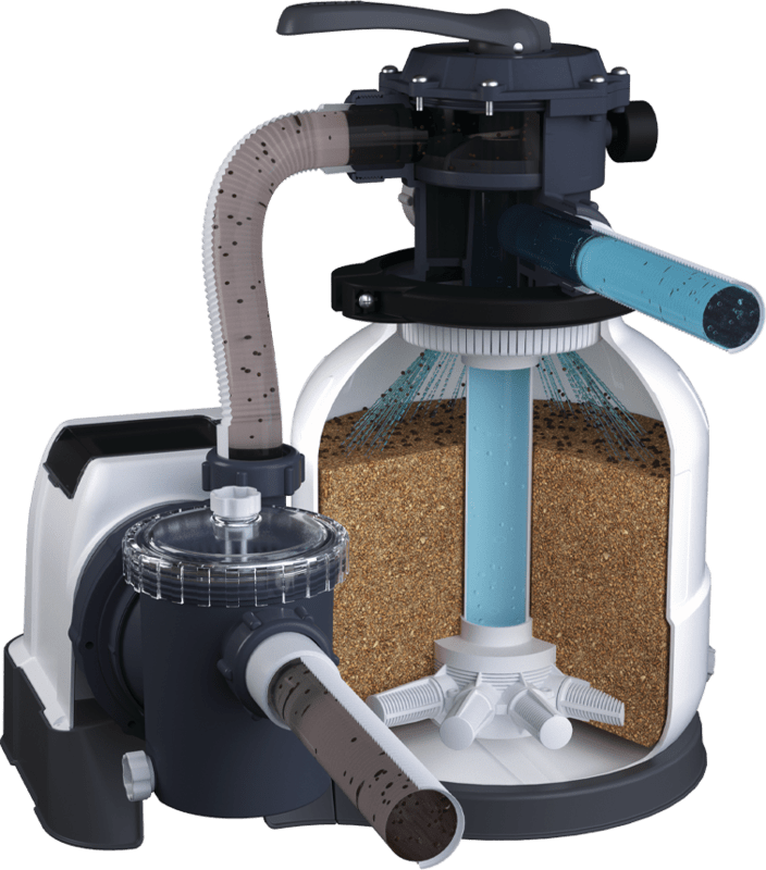 Peščena filtrirna naprava filtrira 8000 litrov bazenske vode na uro. Filtracija je zasnovana za bazene do 35.000 litrov. Voda v bazenu se s črpalko sesa skozi filter in jo piha v šestpotni ventil in nato v zgornji prostor posode. Nato se voda potisne v spodnji prostor posode. Skozi ventil se voda vrača v bazen. Za to filtrirno napravo je potrebnih 35 kg filtrirnega peska. Če pesek polnila ni del paketa Če želite na filtracijo priključiti cevi premera 32 ali 38 mm, je potrebno kupiti 2 kosa redukcije za filtracijo.