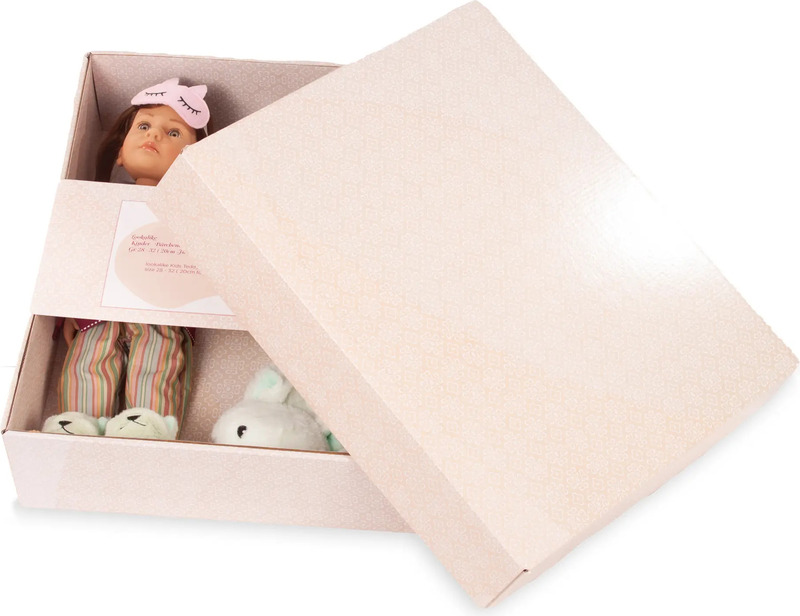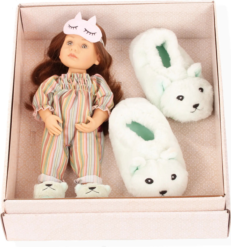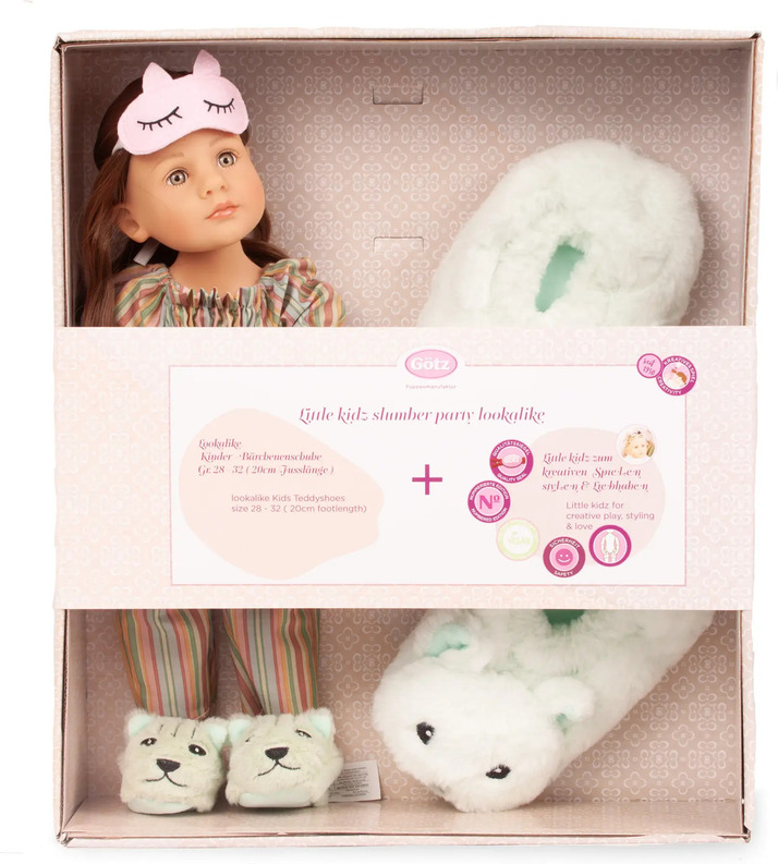 Za malo oboževalko pižamnih zabav je ta set pravi hit, saj ima mamica punčke enake copate kot njena punčka. Copati so primerni za številke čevljev 28 – 32, so super mehki, puhasti in res zabavni. Punčka Little Kidz ima zelo stiliziran outfit z nabranim zgornjim delom v črtastem vzorcu. Njena maska za spanje, okrašena z očmi in ušesi, zagotavlja miren spanec. Vse je lepo zapakirano v luksuzni darilni škatli s pentljo – preprosto popoln darilni set!