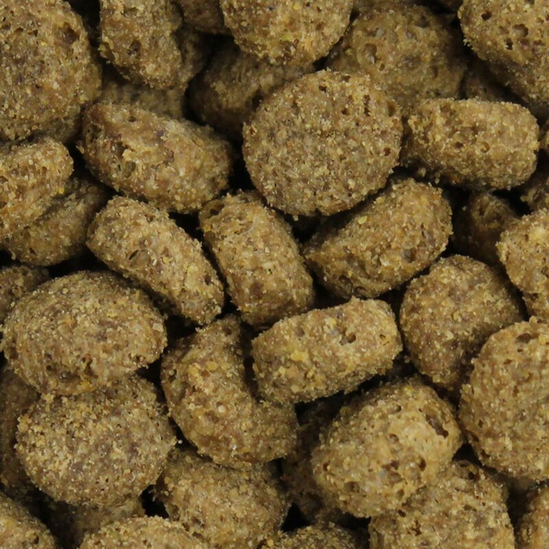 Sestava: piščančje meso, piščanec, ribje meso, sušena pesa, piščančje drobovine, sušena jajca, piščančja maščoba, koruzni škrob, riževa moka, suhi kvas, fruktooligosaharidi, ribje olje, lanena semena, DL-metionin.