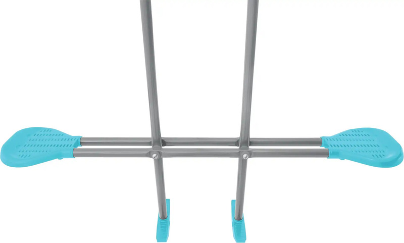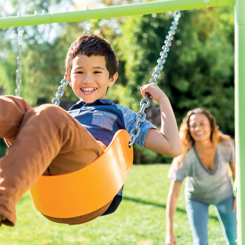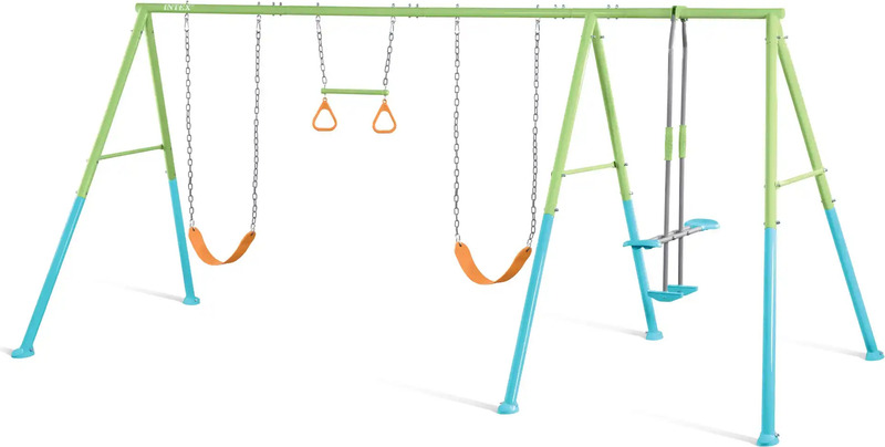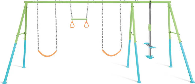 Intex zdaj predstavlja gugalne komplete! Ta novi komplet Swing & Glide je izdelan iz pocinkanih jeklenih cevi s praškastim premazom premera 6 cm za povečano trdnost in konstrukcijsko robustnost. Zasnovan je z osredotočenostjo na visoko odporen okvir, da zagotovi varno in močno konstrukcijo. Natančno zasnovan sidrni sistem zagotavlja odlično stabilnost in varnost. Ta barvni model je opremljen z dvema višinsko nastavljivima gugalnicama, prečko z gimnastičnimi obroči in zabavnim toboganom.