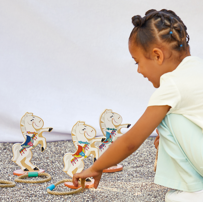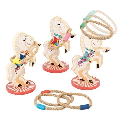 Igra sestavljena iz 3 lesenih konjičkov in 6 debelih vrvi za metanje.