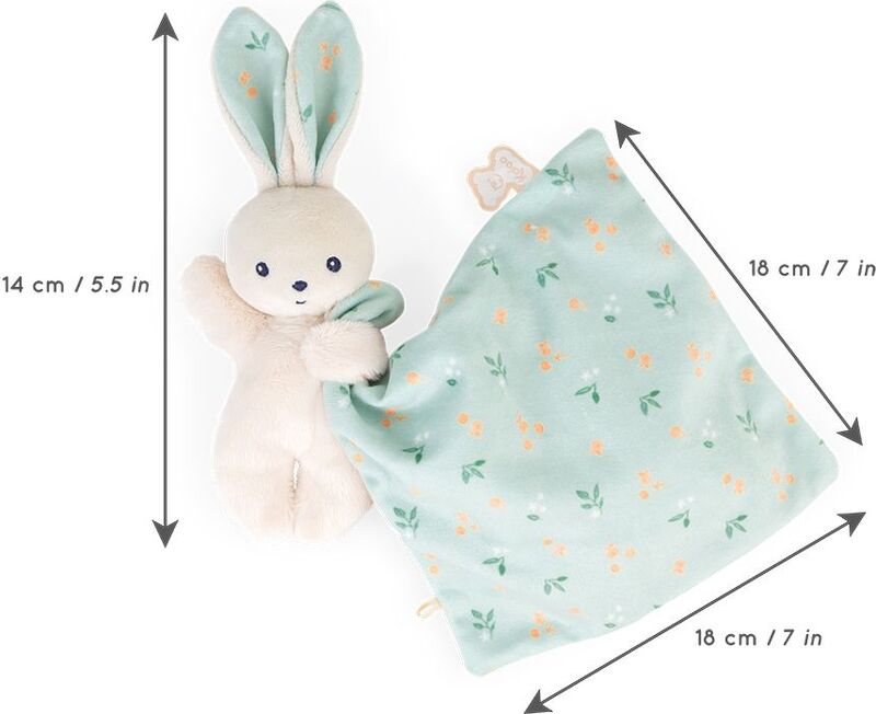 Ta objemni zajček je izdelan iz 100 % ekoloških materialov, pri čemer je polnilo iz recikliranih plastičnih steklenic. Zajček ima puhasto telo iz mikrovelurja, ki je zelo prijetno na dotik in ga zlahka primejo tudi majhne otroške roke. Med tačkami drži kvadratno odejico z nežnim in poetičnim potiskom zlatih limon in podeželskimi detajli. Enaka motiv se nahaja tudi znotraj njegovih dolgih ušes, kar dopolnjuje harmoničen videz igrače. Izdelek je pakiran v stilni škatli, ki jo je mogoče ponovno uporabiti kot shranjevalno škatlo.