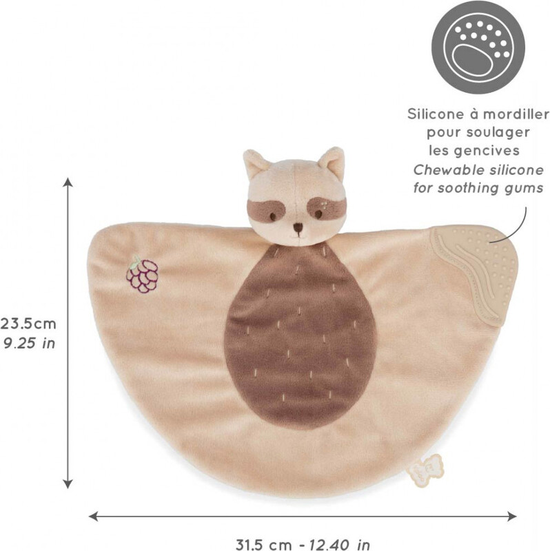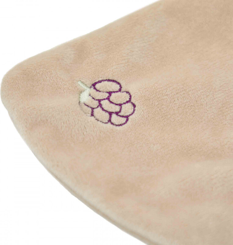 Igrača iz kolekcije Grignoti izstopa s svojo ultra nežno teksturo iz mikrovelurja in premišljenim dizajnom. Ena del igrače je sestavljena iz kakovostnega silikonskega grizala z različnimi utori in majhnimi izboklinami, ki nežno masirajo boleče dlesni otroka. Rakun ima prijetno rjavo barvo in je okrašen z nežno vezenino njegovega najljubšega sadja – grozdja. Zaradi kompaktne oblike in mehkih materialov se enostavno drži tudi v majhnih otroških rokah, kar spodbuja razvoj fine motorike in tipa.