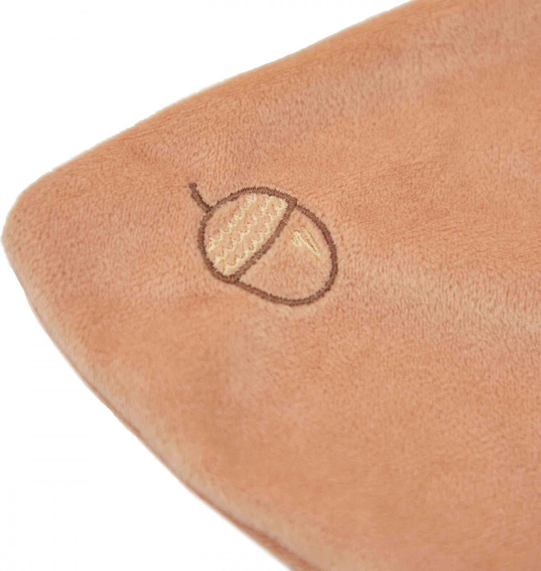 Igrača iz kolekcije Grignoti je izdelana iz izjemno mehkega mikrovelurja, ki je zelo prijeten na dotik. Na enem koncu igrače se nahaja prilagodljiv silikonski del z teksturo (utori in izbokline), ki je idealen za žvečenje in nežno masažo občutljivih dlesni. Veverica ima toplo oranžno barvo in je okrašena z detajlnim vezenjem lešnika, kar igračo naredi igrivo in izvirno. Zaradi svoje velikosti in lahkosti je idealna za majhne otroške roke.