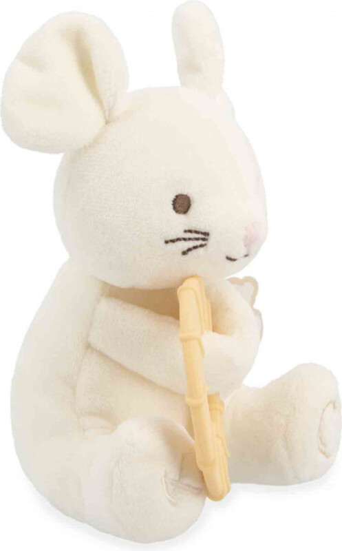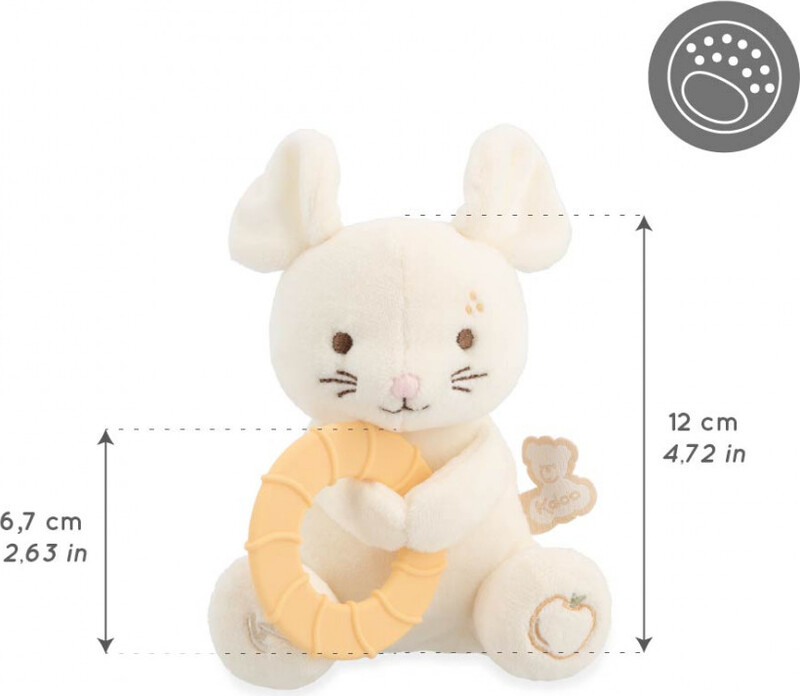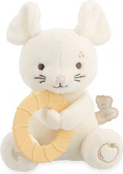 Prikupna bela miška drži v tačkah teksturiran silikonski obroček, ki nežno masira dlesni in pomaga pri lajšanju bolečine. Obroček ima premer 12 cm in je zasnovan tako, da ga lahko enostavno primejo tudi majhne otroške roke. Miška je izdelana iz izjemno mehkega mikro-velurja, ki otroku nudi občutek udobja in varnosti. Zanimiv detajl je izšito jabolko na tački, ki stimulira otipno zaznavanje. Igrača je izdelana na ekološki način iz najmanj 70 % recikliranih materialov, pri čemer tudi sama polnitev sestoji iz 100 % recikliranega poliestra.