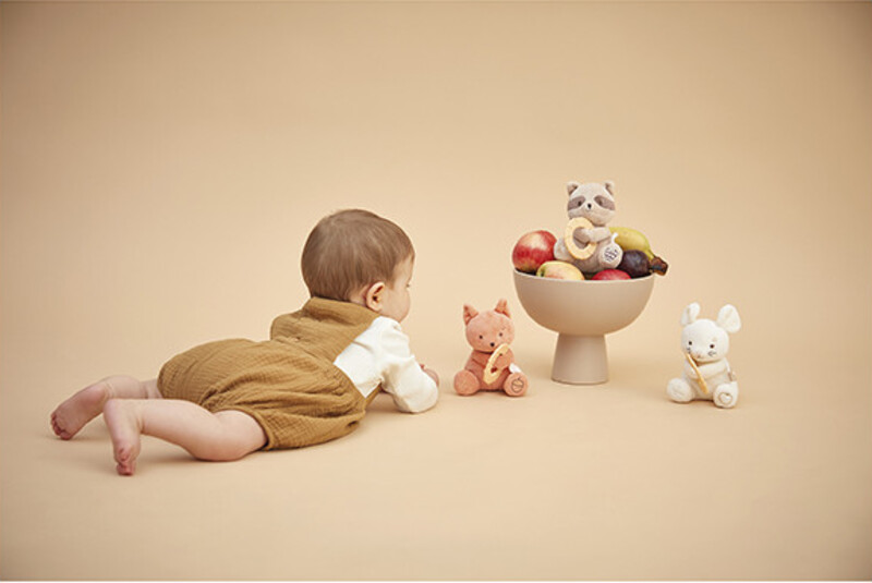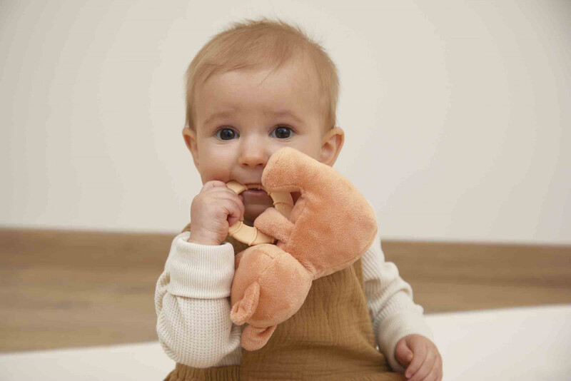 Kaloo Grignoti - Plišasta grizala veverica je ljubek in mehak spremljevalec, ki združuje prednosti plišaste igrače in funkcionalne pripomočke za pomiritev dlesni pri rasti prvih zobkov.