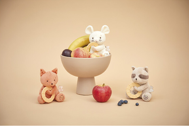 Veverica drži v svojih tačkah teksturiran silikonski obroček, ki je idealen za nežno masažo občutljivih in otečenih dlesni. Sama figura je izdelana iz izjemno mehkega mikro-velurja, ki je zelo prijeten na dotik in nudi otroku občutek varnosti. Zanimiv detajl je izšita lešnikova lupina na tački, ki služi za stimulacijo tipa. Igrača je izdelana na ekološki način z uporabo najmanj 70 % recikliranih materialov, pri čemer je polnilo 100 % recikliran poliester.
