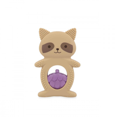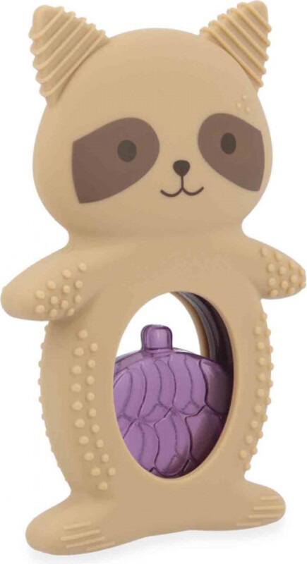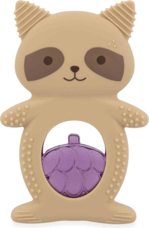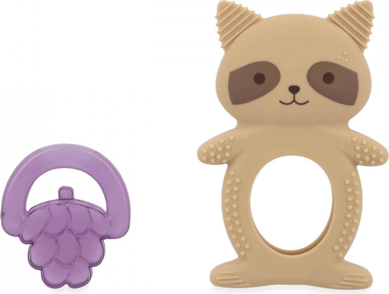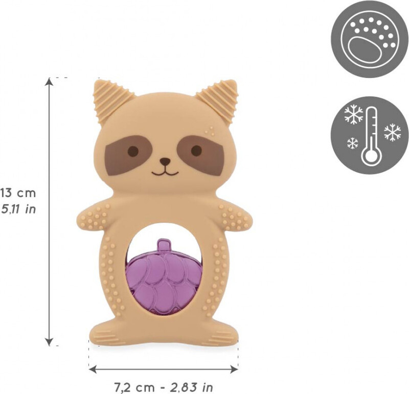 Igrača je sestavljena iz dveh delov: mehkega silikonskega obroča v obliki rakuna in ohlajevalnega dela v obliki grozdja, napolnjenega z vodo. Ohlajevalni element nudi ciljno pomoč po ohladitvi v hladilniku (10 do 20 minut), ko hladen površina pomaga pomiriti vnete in občutljive dlesni. Telo rakuna vsebuje različne teksture, utore in izbokline, ki so idealne za nežno masažo dlesni in stimulacijo tipa. Zaradi ergonomske oblike se igrača dojenčkom enostavno drži, kar naravno razvija njihovo fino motoriko.