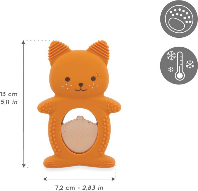 Duo sestavlja mehak silikonski obroč v obliki veverice in ohlajevalni del v obliki lešnika. Ohlajevalni element, napolnjen z vodo, nudi ciljno pomiritev občutljivih dlesni po ohladitvi v hladilniku za 10 do 20 minut. Telo veverice je pokrito z drobnimi izboklinami in utori, ki nežno masirajo dlesni in spodbujajo otipno zaznavanje otroka. Zaradi ergonomske oblike in lahkega materiala je igrača idealna za majhne otroške roke, kar pripomore k razvoju fine motorike.