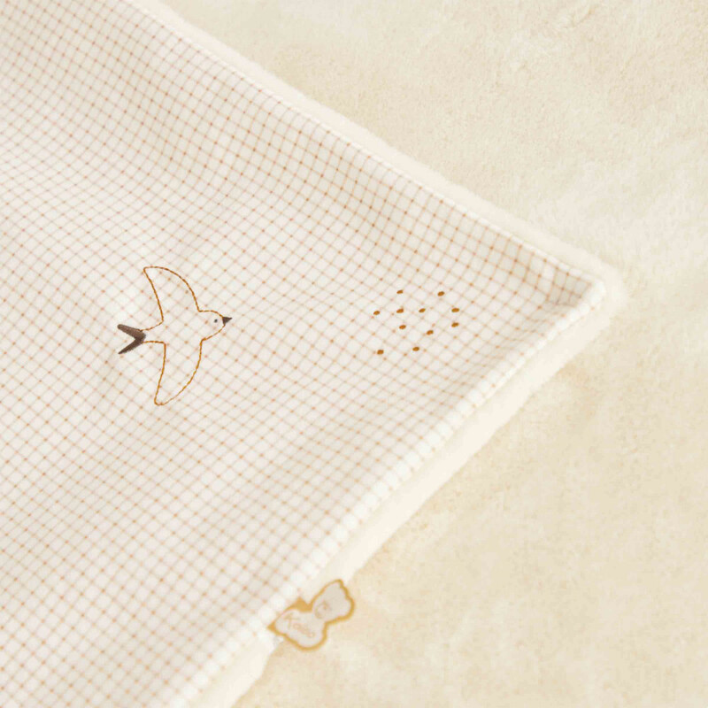 Odeja je izdelana iz kombinacije dveh luksuznih materialov: nežnega mikro-velurja in puhaste umetne krzna, kar jo dela idealnega spremljevalca za spanje v posteljici, počitek doma ali sprehode v vozičku. Oblikovanje odeje je brezčasno in elegantno - krasi jo nežna karirana vzorec (gingham) z detajlno vezenino lastovke. Zaradi lepega darilnega pakiranja je ta odeja tudi odličen nasvet za darilo ob rojstvu dojenčka. Poudarjamo tudi ekologijo, zato je ta izdelek izdelan iz 99 % recikliranih materialov.