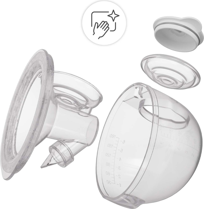 Del paketa je set lijakov (27 mm, 24 mm, 21 mm, 19 mm, 17 mm), ki olajša prilagajanje velikosti vaši anatomiji, kar se odraža v resničnem udobju pri črpanju. Steklenička s prostornino 180 ml vam omogoča črpanje brez pogostega praznjenja. Enostavna montaža in zmanjšano število delov poenostavita pranje in sterilizacijo, kar dodatno podpira še en set 6 membran in 6 ventilov za daljšo uporabo, in to do 12 mesecev.