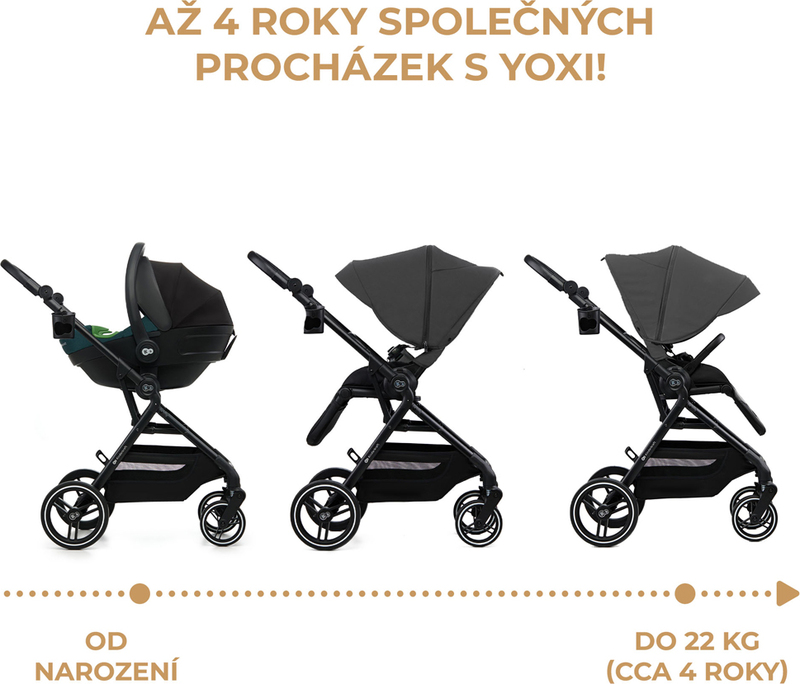 Športni voziček YOXI je namenjen otrokom od rojstva do približno 4 let. Med sprehodi vas bo spremljal udoben voziček, ki se lahko pritrdi v smeri naprej ali nazaj k staršu. YOXI omogoča ustvarjanje POTOVNEGA SISTEMA zahvaljujoč priloženim adapterjem.