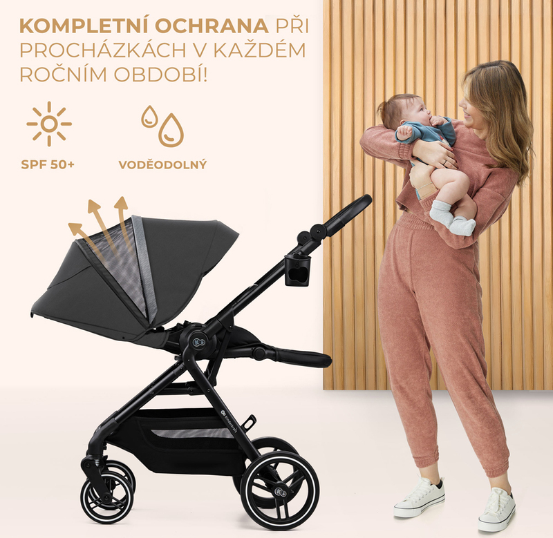 Senčnik vozička je velik in vodoodporen, s filtrom UPF50+. Ima dodatni prezračevalni panel in okno za stik z otrokom, skozi katerega lahko spremljate, kaj vaš otrok počne.
