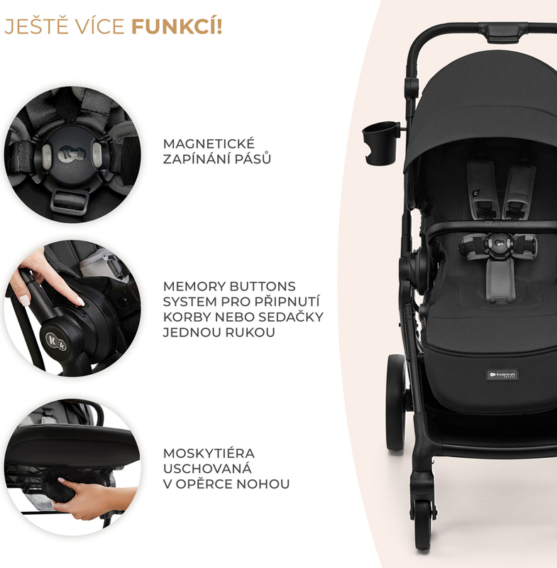 Voziček je na voljo tudi z dodatki: mrežo proti insektom (v opori za noge, ki jo boste vedno imeli s seboj), držalom za skodelico, torbo za ročaj za starše in adapterji za otroški avtosedež.