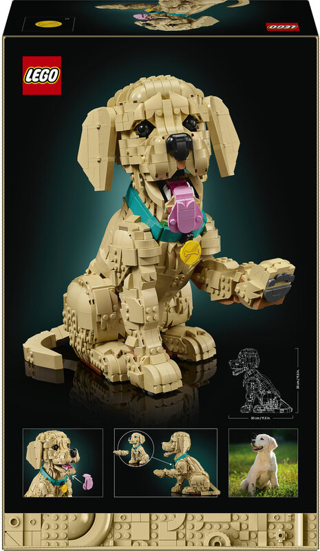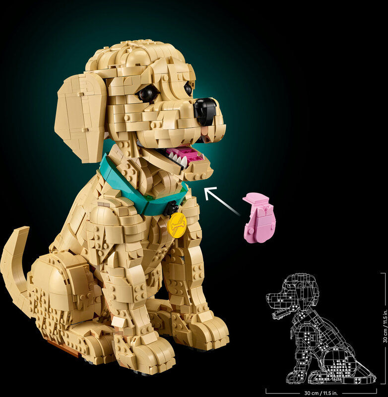 DIMENZIJE – Po končanju meri model LEGO® Icons Kuža zlatega prinašača iz 2.102 kosov več kot 30 cm v višino