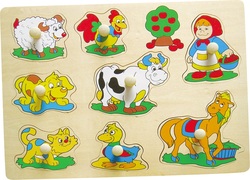 - Šest štrlečih lesenih oblik živali je mogoče zlahka prijeti in jih vstaviti v pravilne rezkane utore na barvni plošči.