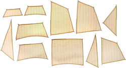 Po odprtju pokrova škatle boste našli lesene dele modela iz vezanega lesa, komplet letvic, drobne komponente zaprte v plastičnem prozornem blisterju, komplet risb in priročnik v EN, DE, FR in IT.