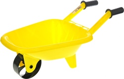 Plastična samokolnica rumene barve za male vrtnarje ali gradbenike.