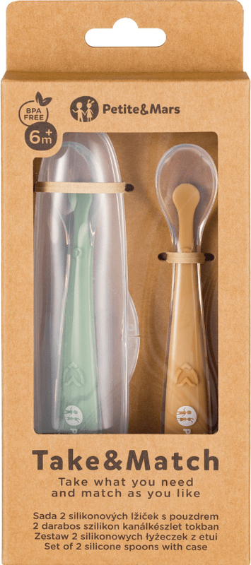Komplet za hranjenje TAKE&MATCH je zasnovan tako, da je vsak obrok zabavna izkušnja. Vsaka žlička je bila skrbno oblikovana, da spodbuja vašega otroka k odkrivanju hrane in razvoju samostojnosti pri jedi. Fleksibilen silikonski material omogoča žličkam, da se rahlo upogibajo, prilagajajo gibanju vašega otroka in olajšajo samostojno hranjenje. Mehki živilski silikon je prijazen do občutljivih dlesni in prvih zobkov, medtem ko ergonomska ročica udobno prilega majhnim rokam.