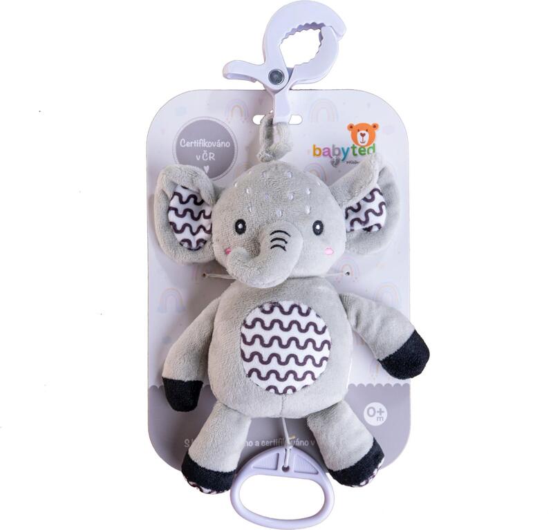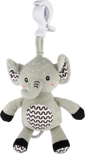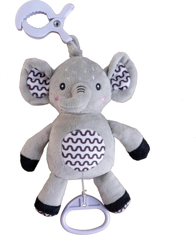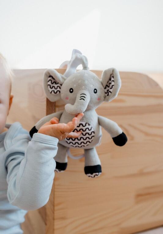 Prijazen plišasti slonček z navijalnim glasbenim mehanizmom je idealna igrača za dojenčke že od rojstva. Po potegu začne slonček predvajati nežno, pomirjujočo melodijo, ki pomaga dojenčku, da se umiri in lažje zaspi.