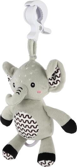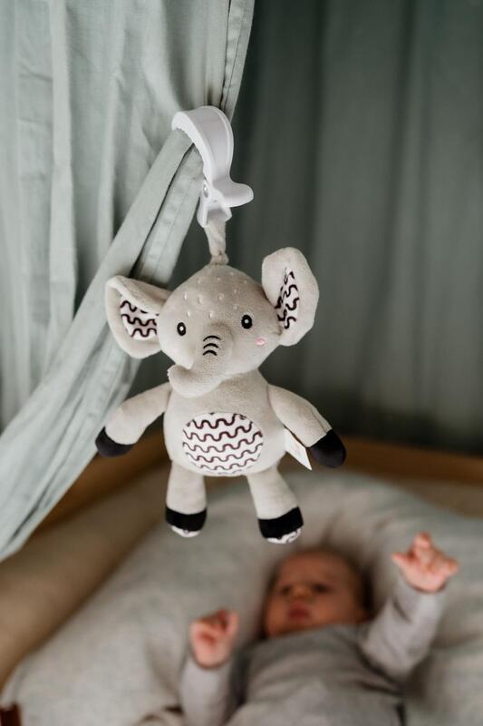 Zahvaljujoč praktičnemu obešalnemu klipu lahko slončka enostavno pritrdite na posteljico, voziček, avtosedež ali igralno obok. Dojenček bo tako imel svojega mehke prijatelja vedno pri sebi – doma in na poti.