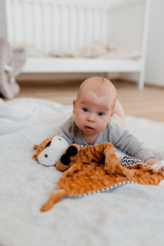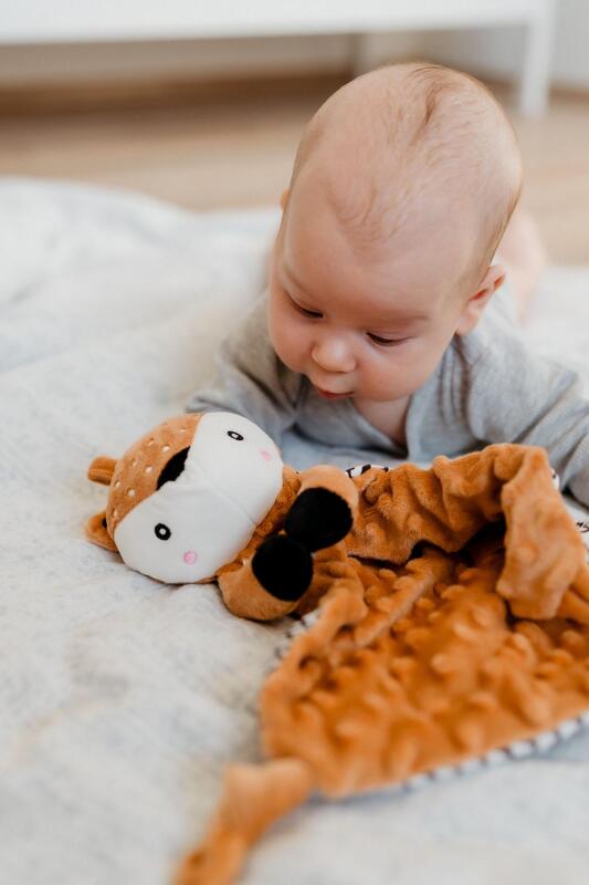 Mehak material tipa minky s 3D pikami nudi prijeten dotik, ki dojenčka pomirja in spodbuja njegov čutni razvoj. Del kompleta je tudi mehka grizala, primerna pri rasti zobkov, in nežna ropotulja, ki spodbuja radovednost in razvija slušno zaznavanje.