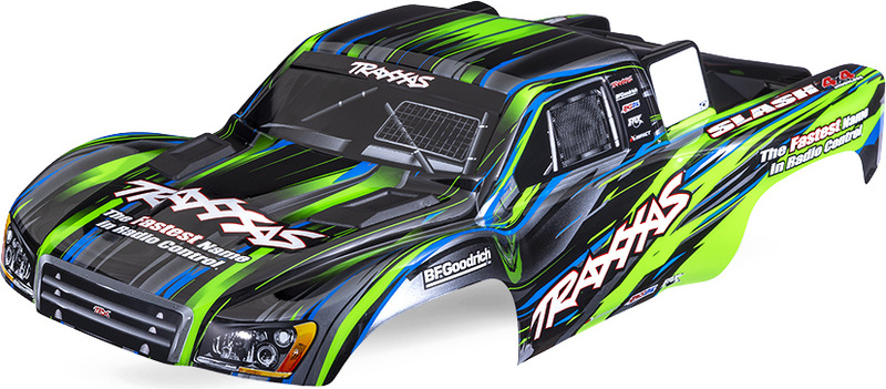 Traxxas karosérie Slash 4X4 zelená. Nabarvená, sestavená karoserie, včetně bezsponkového držáku pro upevnění. Pro starší šasi Slash se sponkovým systémom upínania karosérie je vyžadovaný diel #6940 (Slash 2WD), alebo diely #6976 a #10125 (Slash 4x4).