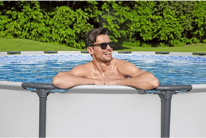 Bazen Bestway Power Steel (prostornina vode 23.062 l) je samonosilni družinski bazen. Nadzemni bazen za površinsko montažo je izdelan iz troslojnega PVC-ja. Zahvaljujoč svoji kovinski konstrukciji je zelo močan in stabilen. Privlači s preprosto montažo in dolgo življenjsko dobo. Krožni bazen s kovinskim nosilnim delom, ki ima protikorozijsko obdelavo. Stranske stene iz troslojne PVC in poliestra.
