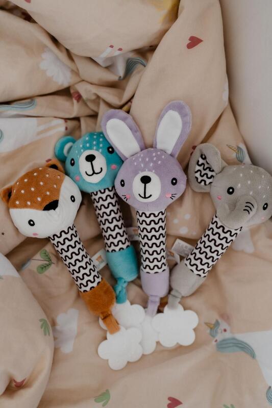 Zaradi dolgega mehkega telesa se dobro drži v majhnih rokah, ob pritisku pa oddaja nežen piskajoč zvok, ki spodbuja slušni razvoj otroka in naravno pritegne njegovo pozornost. Na spodnjem delu je nameščen mehki plastični grizalnik v obliki cvetlice, ki olajša občutljive dlesni pri rasti prvih zobkov. Kontrastni črno-beli vzorci na telesu hkrati podpirajo razvoj vizualnega zaznavanja.